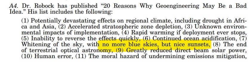 Now keep in mind, the skies already had been being sprayed since the late 1990’s but the spraying has all been done under the military, and the ultimate goal is to make it public, so it can come out of the shadows and the Stratospheric Aerosol Injection patent holders, such as GeoEngineering advocate David Keith, can finally reap the financial rewards of their patents. So, during this government meeting, one very interesting statement was made. Doctor Alan Robock was asked about pros and cons of spraying the skies. Regarding the downsides, his response is telling: