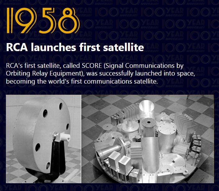 RCAs headquarters were 30 Rockefeller Plaza which, at one point, was known as the RCA building. They also were involved in the World’s Fairs and later, the NASA satellite hoax, in which RCA claimed this piece of sh*t was orbiting in “space” and beaming transmissions back to earth: