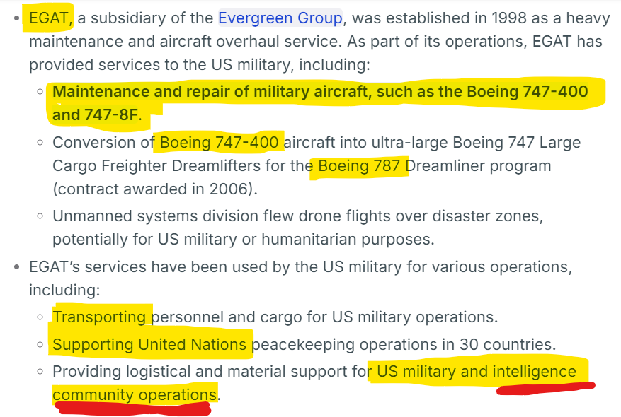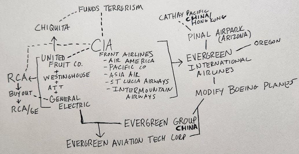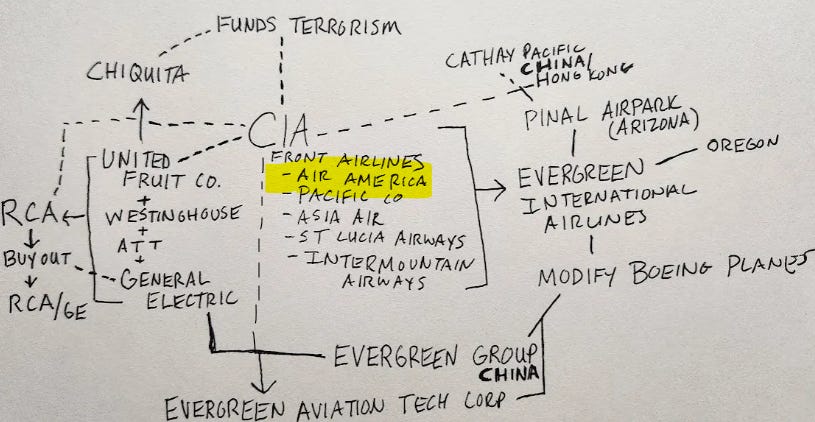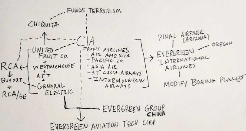 So, Evergreen Group owns a whole lot of Evergreen-companies in the air travel industry as well as cargo ships and more but we are supposed to assume there is no relation between the two Evergreens… which are both involved in aviation… and both work for the US military and one of which was owned by the CIA and the other works with the CIA... Now here’s where things get even more eyebrow raising…