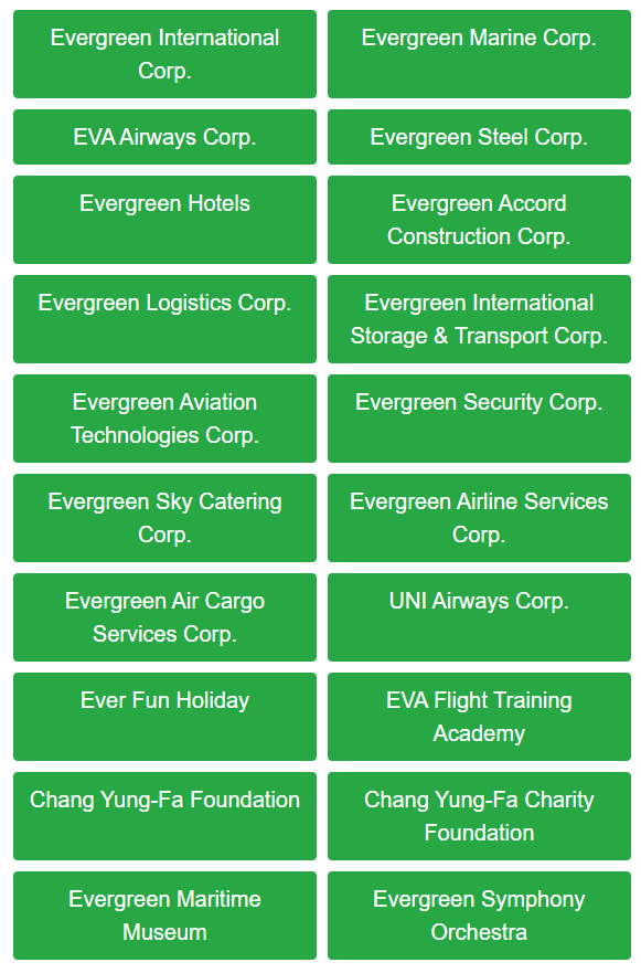Evergreen Aviation Ground Logistics Enterprise, Evergreen Defense and Security Services, Evergreen International Airlines, Evergreen International Aviation, Evergreen Systems Logistics, Evergreen Trade, and Supertanker Services