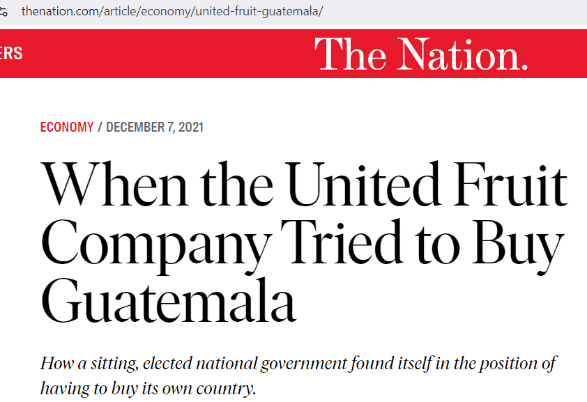 The article starts by saying, “In 1952, the United Fruit Company made the elected government of Guatemala a simple offer: If y’all want democratic self-government so badly, you can have it—for a small fee. It’ll cost you about $19,355,000.”