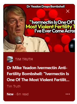 Dear Dr. Yeadon, I cannot thank you enough for being the first famous doctor to speak out against Ivermectin. Tim Truth and I have been trying to warn others about this product and we have been attacked, called shills and lost subscribers thus losing income, so your words are much appreciated vindication. I know your time is valuable so I will keep it short. With these “alternative cures” and health in a bottle products, the goal isn’t to kill us, it’s to steal our fertility and, God willing, produce some side effects along the way so we can make trips to see our doctor. Here’s some quick cliff notes for you. I will include links to my extensive research below: