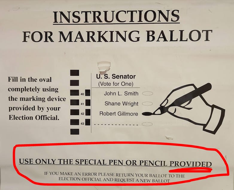What was PROVIDED was a black marker, not a pen, nor a pencil. I should mention, these signs never appeared prior to Trump winning 2016. The signs, along with the black permanent markers, have been at every election since.