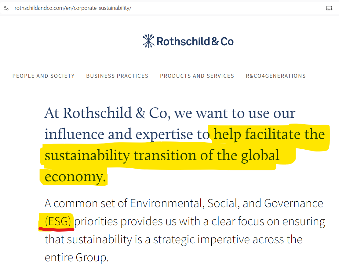 “In March 2018, Rockefeller Asset Management joined the United Nations Environment Programme Finance Initiative, stating its intent to build a concentrated long-term portfolio emphasizing environmental, social, and governance (ESG) factors. In May 2019 it launched two ESG-driven investment funds: the Rockefeller US ESG Equity Fund; and the Rockefeller Global ESG Equity Fund, a UCITS fund domiciled in Europe. In January 2021 Rockefeller Asset Management, in partnership with Bloomberg, launched the Bloomberg Rockefeller U.S. All Cap Multi-Factor ESG Improvers Index, which ranks a company's improvement on ESG issues relative to industry peers, while also taking quality and low volatility into account, in addition to incorporating shareholder engagement techniques.”. To put this in plain English, ESG means Social Credit Scores.