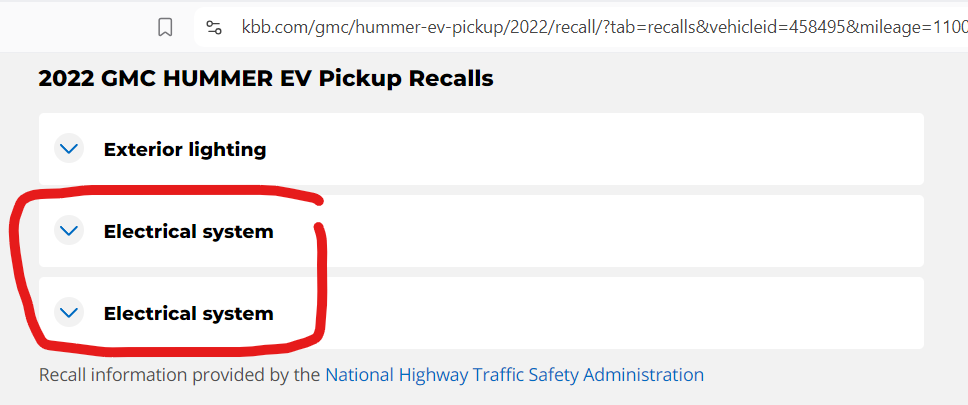 A 2022 EV Hummer currently has three open recalls, two of which are very serious electrical issues: