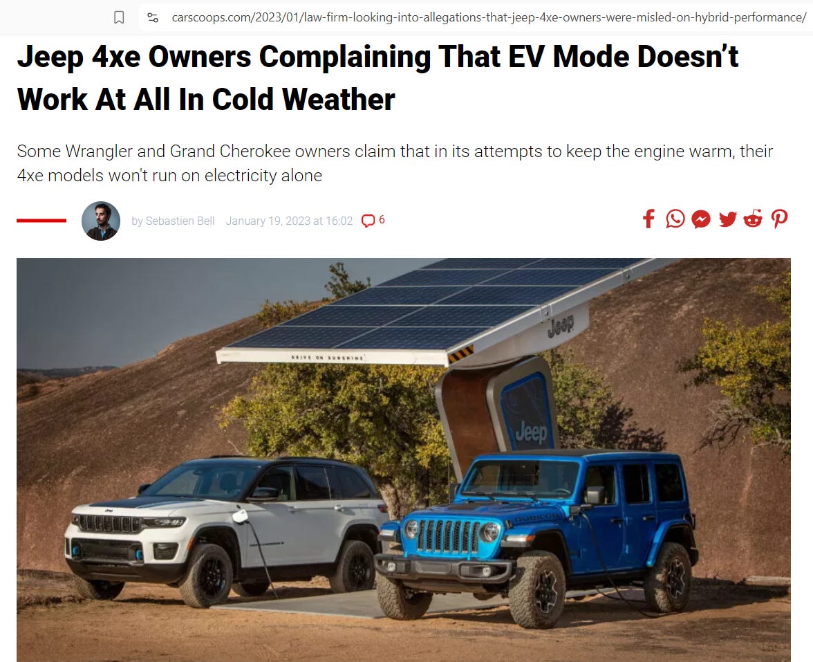 While all of the mainstream auto makers are heavily pushing their EV line, people who recently purchased them are fed up with frequent trips to the dealership mechanic due to recalls, the electric function malfunctioning, motors and batteries burning out in the first year of use, not being able use the EV function in cold weather, in the case of the Ford Lightning, having to stop and charge twice (45 minutes per charge) to drive 280 miles only to discover the few charging stations there are not working, and other assorted issues.