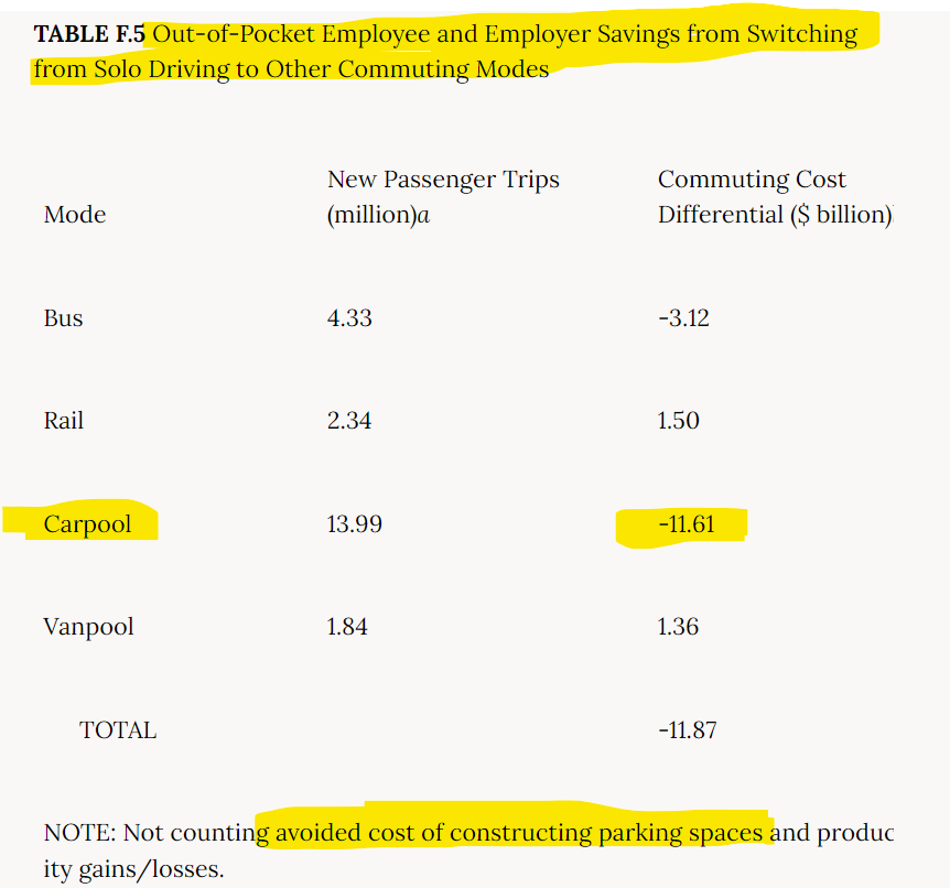 Even back in 1992 they were scheming ways to eliminate private vehicle ownership under the guise of Climate Change. A document called Policy Implications of Greenhouse Warming: Mitigation, Adaptation, and the Science Base was published. The goal was to find ways to get people to not drive, or if they had to drive, only drive in a car pool. The part I find most interesting about this document is that they realized it would be easier to incentivize employers to stop their employees from driving solo as opposed to trying to convince people directly not to drive alone. The first idea they had was to convince businesses to not offer as much employee parking therefore forcing people to carpool. They refer to this as “Parking Management”. They also wanted employers to pitch this as a way their employees could save money - “You guys should just take the bus! Ya’ll will save money!”.