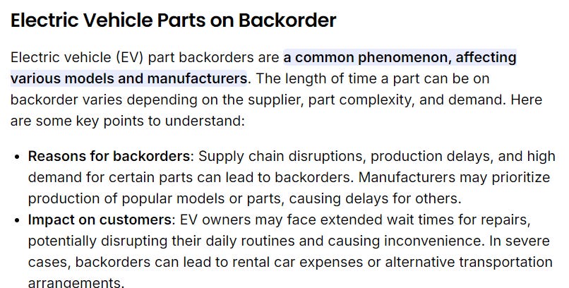 These EVs have so many issues and the repairs take so ridiculously long that vehicles sit in the auto shop for weeks-to-months. I know someone whose 2023 EV, as of August 2024, had spent three months in the dealership shop - that is 1/4 of a YEAR! Because of this, many manufacturers have stopped covering the cost of rental cars even if the vehicle in the shop was just purchased and is still under full warranty! Now you may be thinking, “that sucks for them”, but here’s the bigger picture: