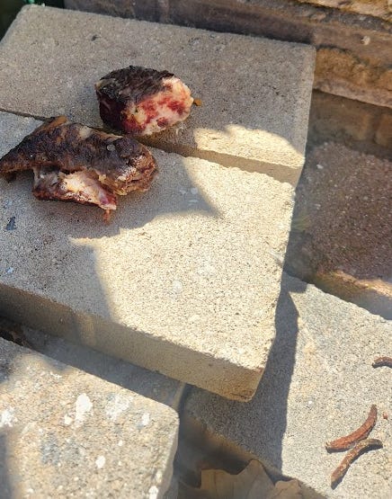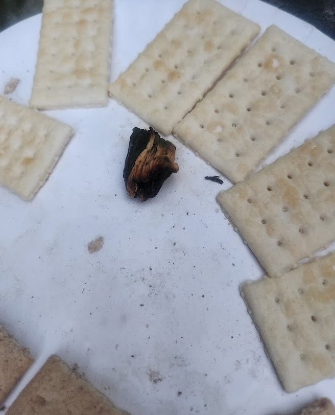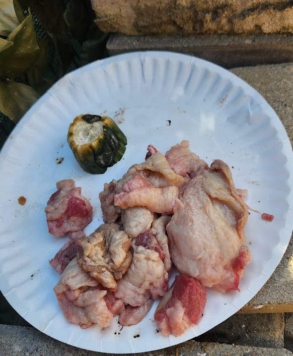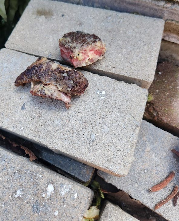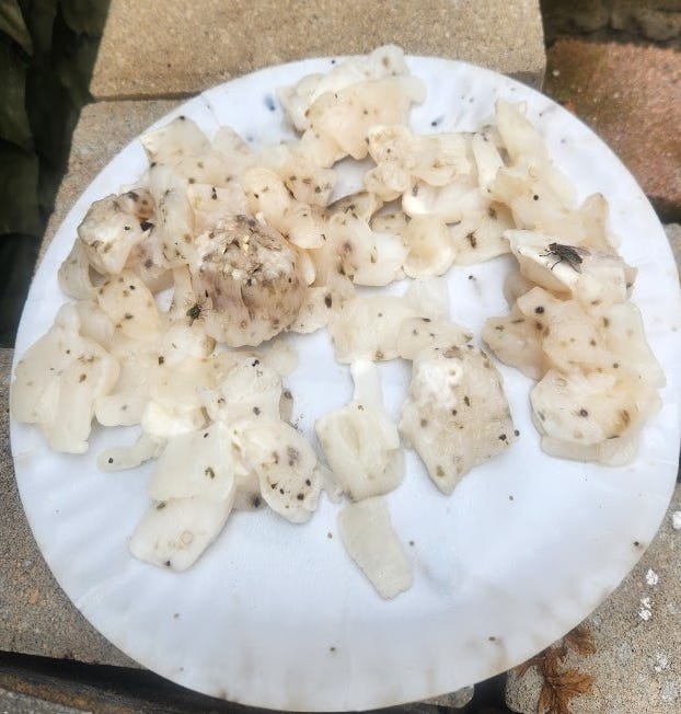 I forgot to get a photo when I put this out, but I had a bag of frozen scallops pieces that had gotten freezer burn. Not only did nobody eat them, but the next day they were covered in black spots. Other than the black spots, they looked exactly like they did when I put them out the prior day. They didn’t even smell.: