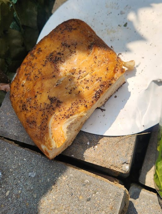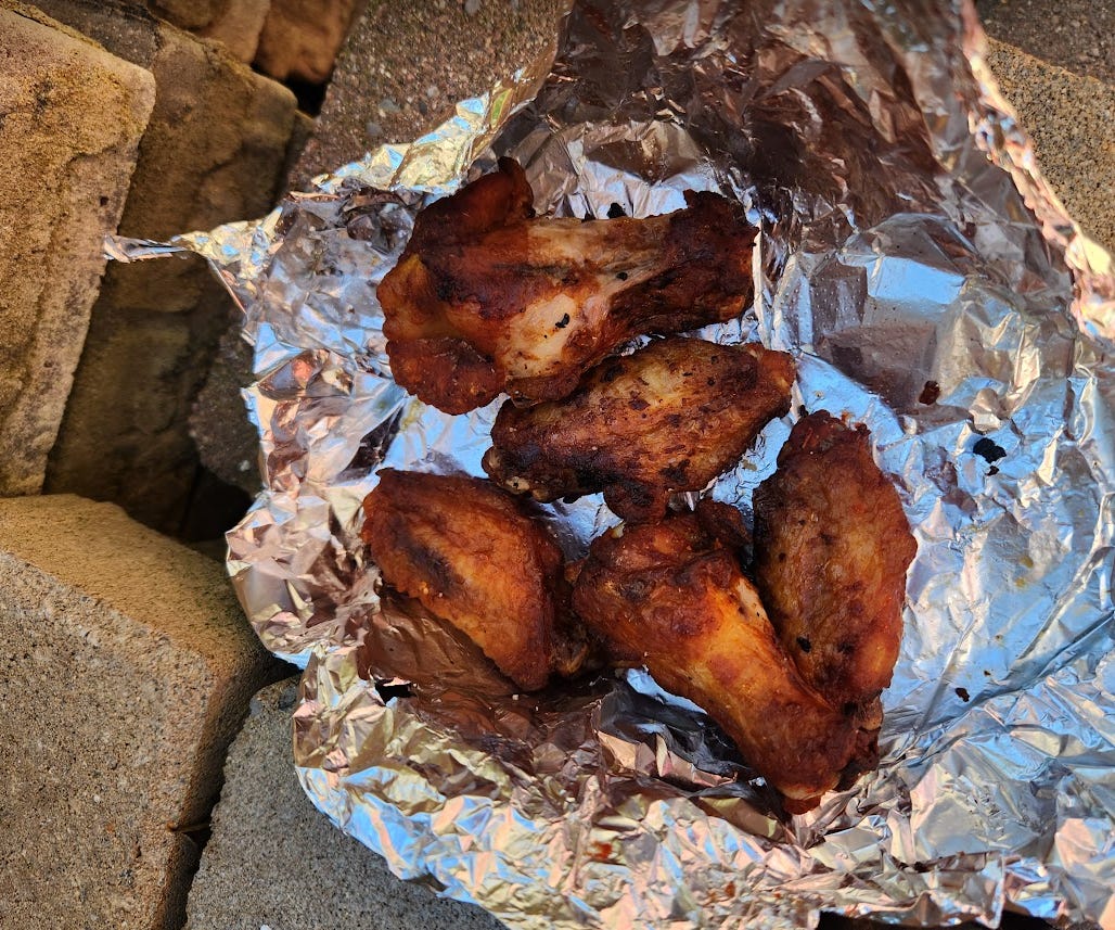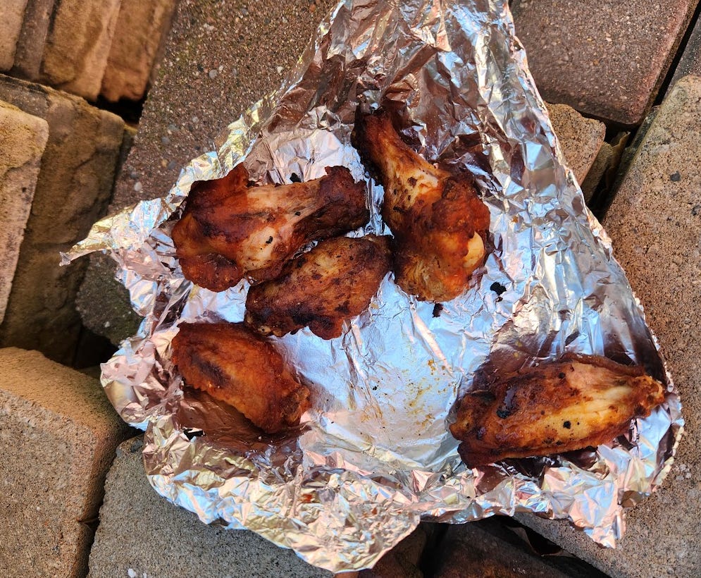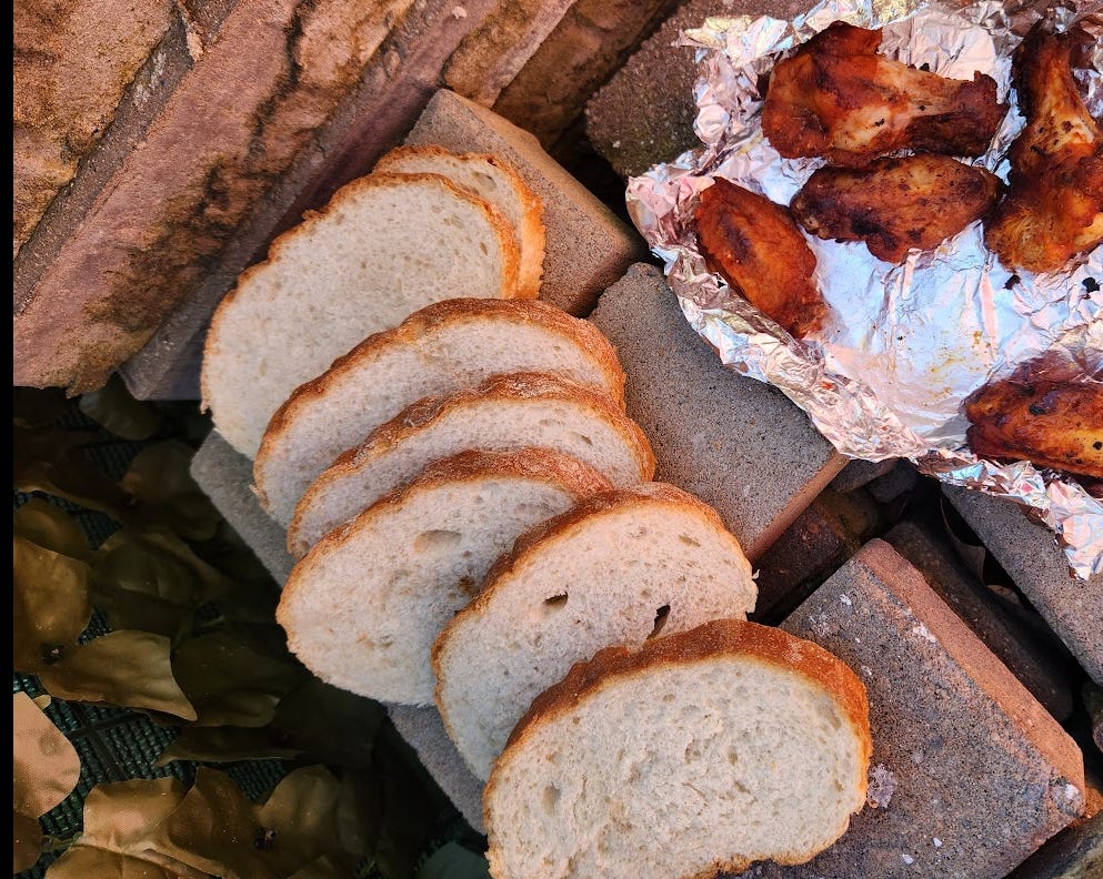 The wings, including the tin foil, had vanished entirely. As far as the bread, someone took a couple bites then bailed: