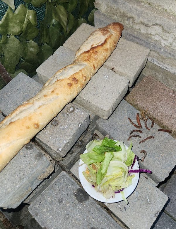 The next day the bread was nowhere to be found. Someone took the whole thing. The salad was shuffled around but none was consumed and those carrots are still there: