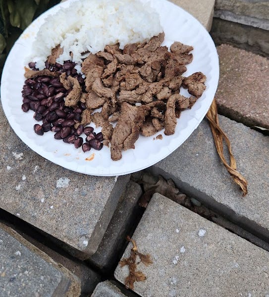White rice, steak strips, black beans: