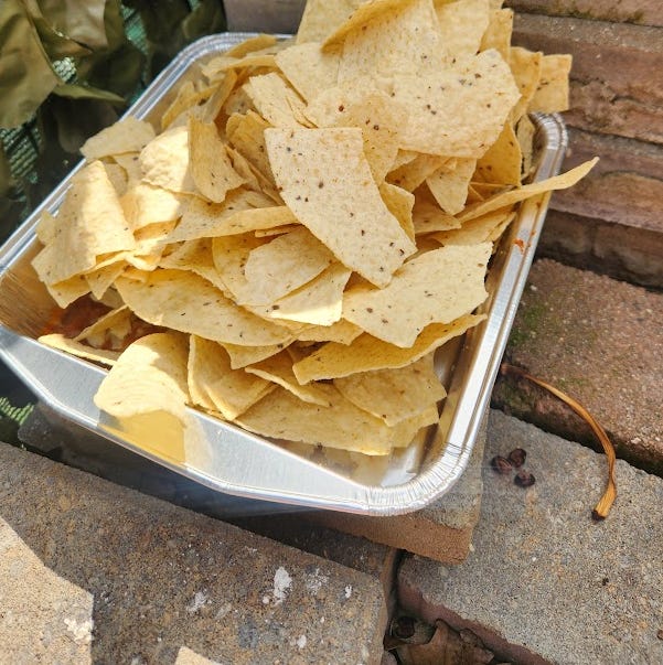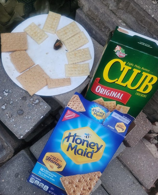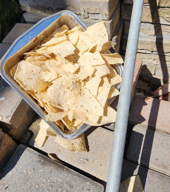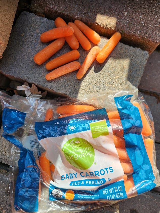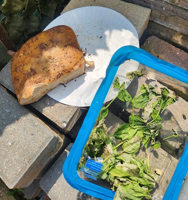 This information lead to us brainstorming the most simplistic experiment imaginable that anyone can do (and if you do, please share your results including what store the food came from). The way this completely-nonscientific-but-totally-commonsense experiment worked was, after dinner I would put a piece of human food out for the animals to eat. The following day, when I got home from work, I would see if there were any takers, which there should be because most of the creatures in our yard are not picky eaters (squirrels, raccoons, rats, mice, skunks, birds, a couple rabbits, opossums, a big fat ground hog and scavenger insects like ants, rollie pollies and slugs). Hopefully this would allow us to begin the process of elimination, therefore narrowing down exactly which foods need to be looked into further.