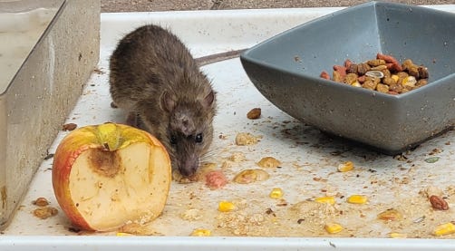 I humanly trap rats and mice and release them in a local nature reserve (the same reserve I told you about in Quietly Stealing the Housing and Land). On June 23rd, I noticed this injured guy, in broad daylight, eating from the squirrel and bird food tray. It looked like he suffered a head wound. He was walking in circles so trapping him and releasing him in the reserve was signing his death warrant. I decided to try to let him heal first so I brought out an organic Honeycrisp apple and sunflower seeds. I hoped he could recover in a week or two so he could be trapped and released in full health. In the meantime he could walk in circles on my deck and eat. He pounded the seeds but avoided the apple.
