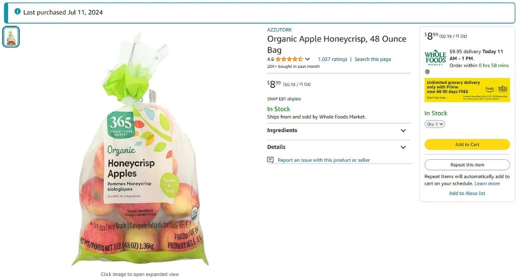 I was hesitant to purchase any more local grocery store Honeycrisp apples due to how sketchy they have been, so on July 11th I I placed a Whole Foods order for their version: