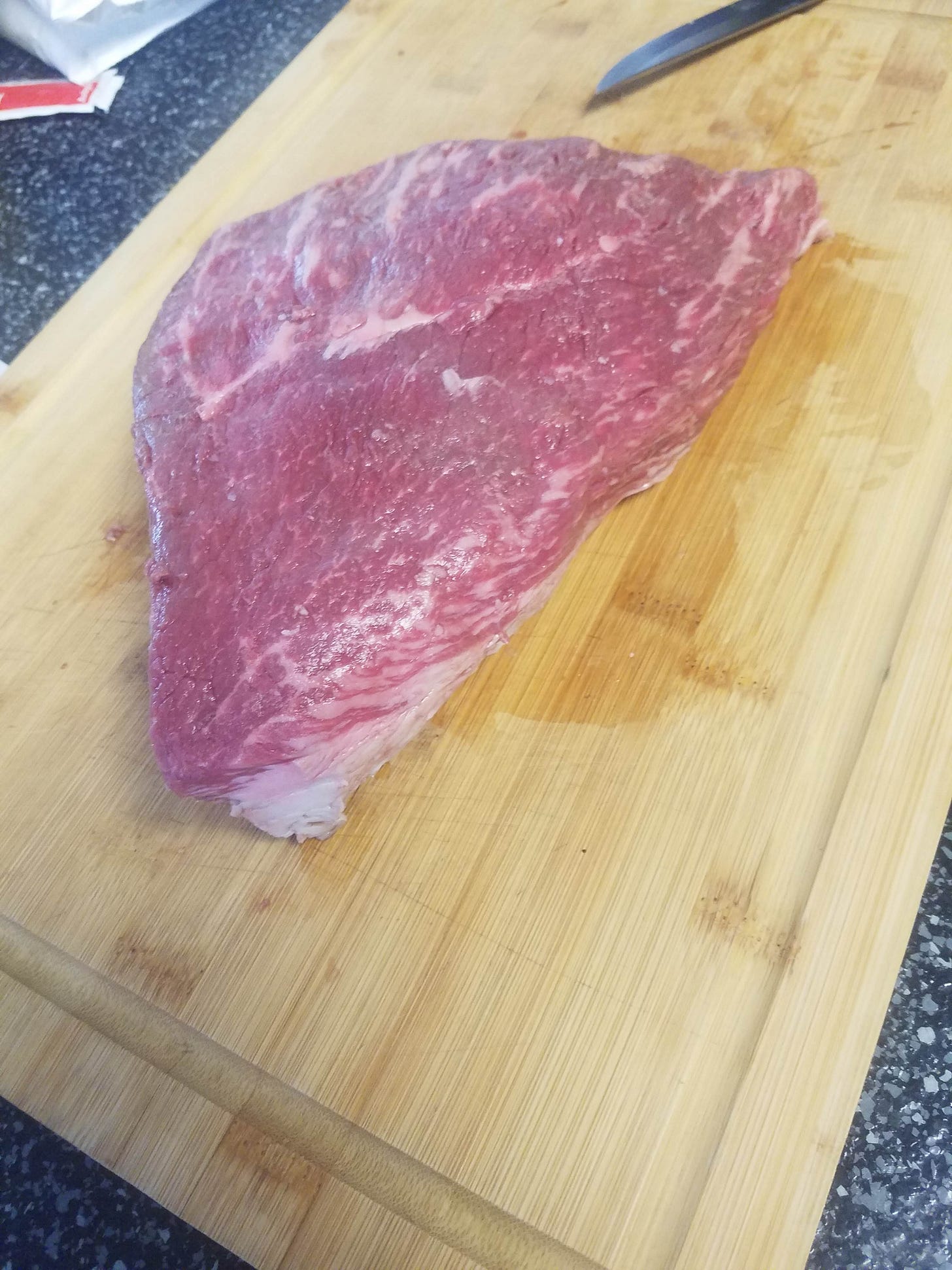 Day 2: The spouse loves to food shop and cooks something every single day out of enjoyment, which is impressive because I despise cooking and if left to my own devices, will eat a head of raw broccoli or starve if need be. I draw the line at any recipe that takes longer than 10 minutes, but my honey bun will spend a full day in the kitchen, cooking and baking while watching Food Network cooking and baking videos, yet never making what is being shown in the video. Anyway, this meat came from a local butcher shop: