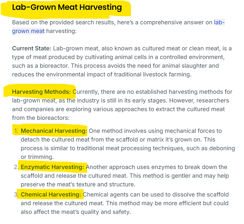 Although Harvested can mean slaughtered, it also happens to be the exact term used in production of synthetic materials, such as “vitamins” and “supplements”, which are usually GMO bacteria based - they grow (aka “raise”) bacteria by feeding it GMO sugar then they put it through a harvesting process then say it’s the same as eating an orange. Lab-grown foods also require harvesting: