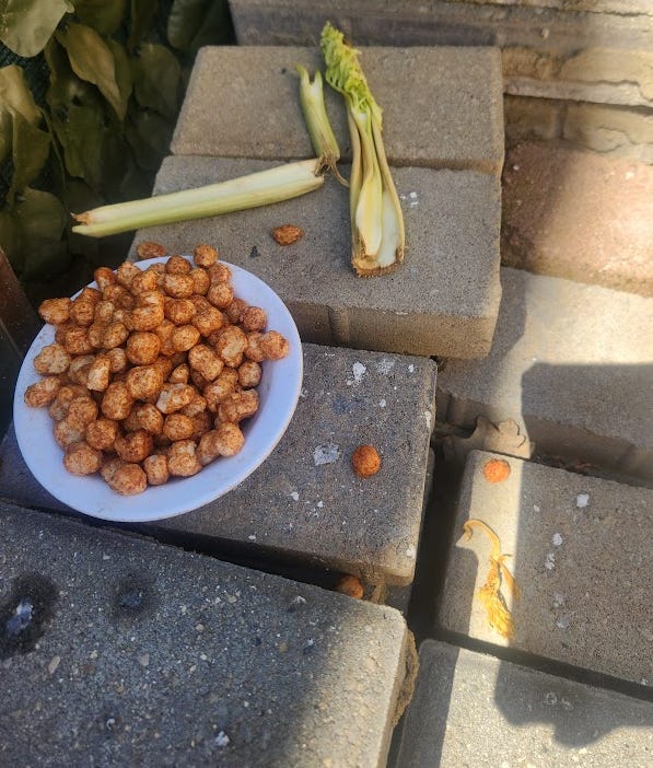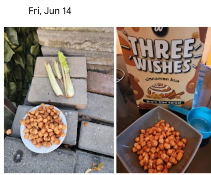 I bought my kids a box of Three Wishes cereal because some podcast I was listening to praised it as a healthy alternative (of course my children won’t touch it). While writing The Vitamin Swindle Part 2: Daily Intake Level Scam, I needed to measure 1.5 cups of cereal (1 serving). I put the cereal outside afterwards along with some celery on June 14th: