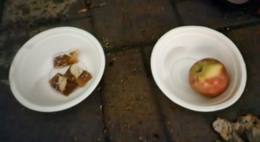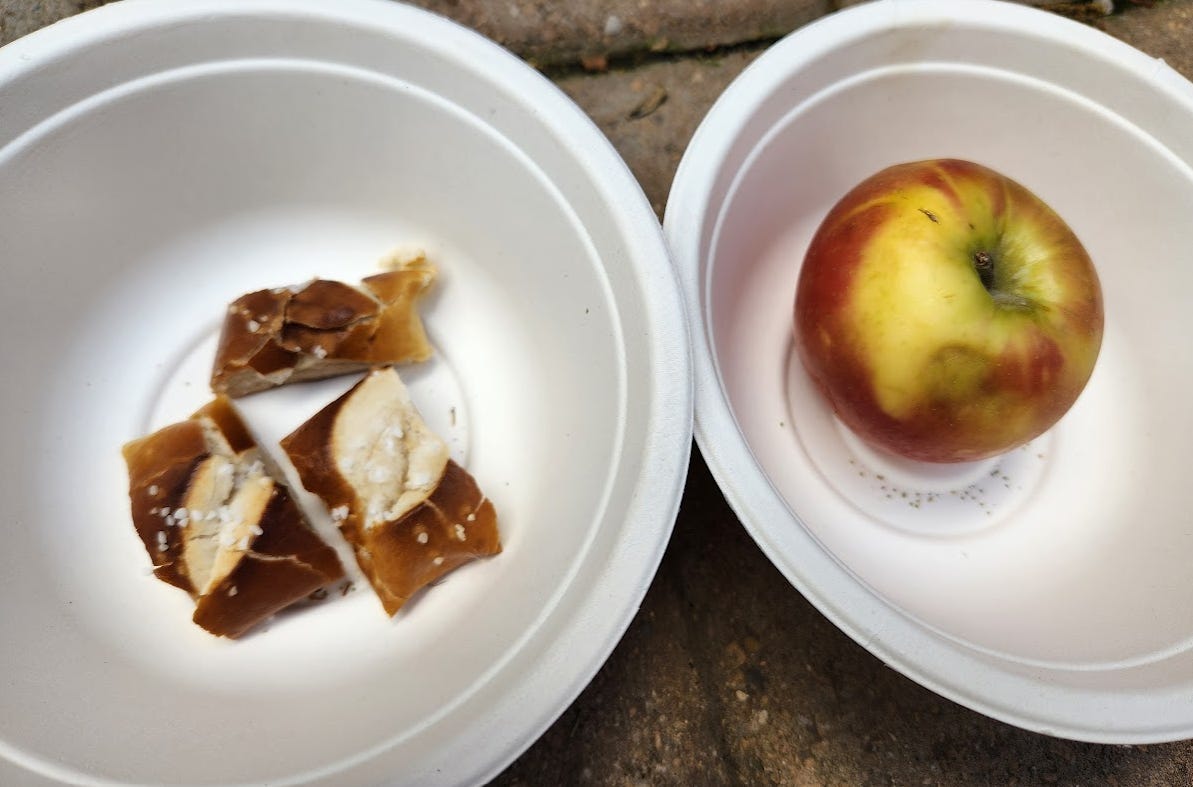 Day 1: I put out a Honeycrisp organic apple from Kroger and three soft pretzel bites.