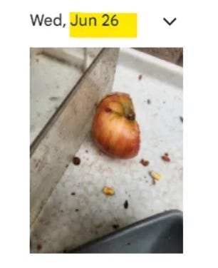 My sweetheart threw it away on June 30th because my wacky experiments need to end when a weird apple has been sitting outside of our door for nearly two weeks. Apparently this issue with apples isn’t just related to organic Honeycrisp. This man noticed the same about a different variety: