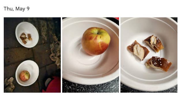Result: Meat was gone, cheese untouched. I forgot what was on the plate next to it and I don’t know why I don’t have a photo of it, but I see an untouched apple slice on the plate: