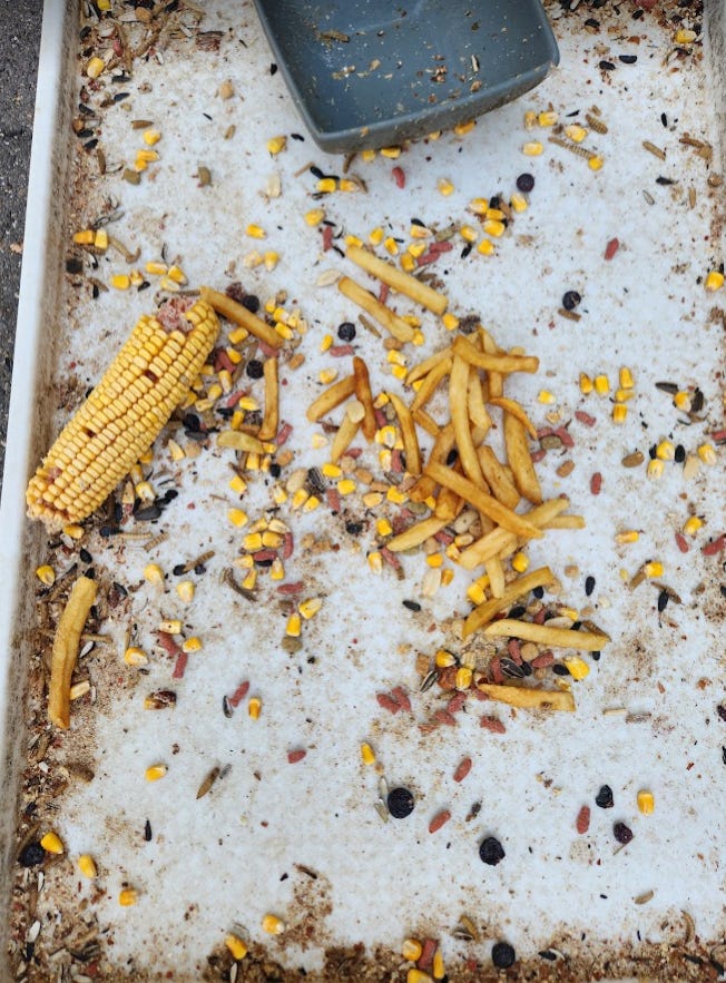 It was way too suspicious for me, so I put the massive blueberries out for the critters along with bird seed, McDonalds fries and dried corn. As you can see, the bird seed was devoured but nobody wanted the berries, fries or the corn: