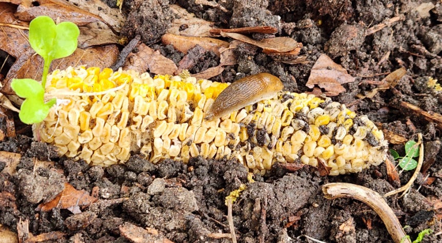 I chalked it up to fluke and forgot about it. Then I tossed this corn in there and it laid there, week after week. Although being slightly discolored, it still had complete kernels. I was shocked that this corn was fully exposed to the elements, sat through multiple rains and still held up. Not only did it hold up, but no rats, mice or raccoons came to enjoy a free meal. In early May 2024, this slug came along to check it out.