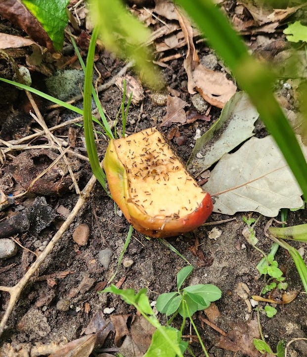 Shortly after I took that photo, a squirrel stole the apple from the ants and enjoyed it.