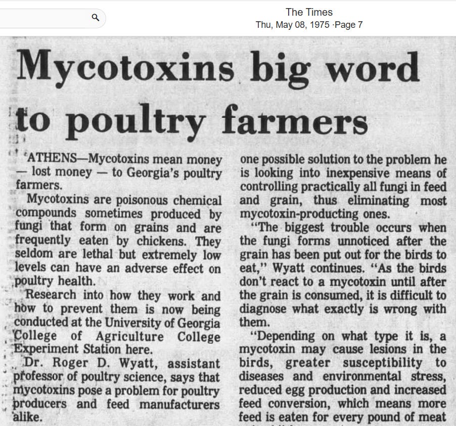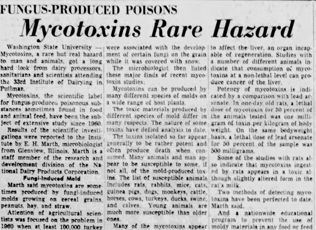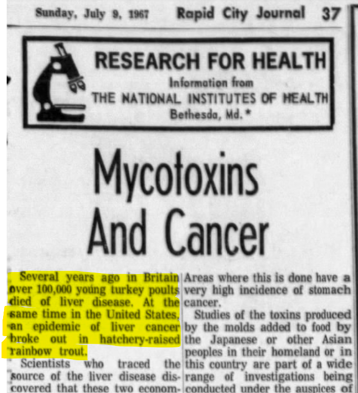 The NIH stepped in to look at the horrific loss Britain had suffered. Over 100,000 young turkeys had dropped dead from liver disease. Across the pond, here in the United States, our trout hatcheries were suffering too. The NIH quickly tracked down the problem. Wanna guess what it was? “The toxic product of common mold”. Yep, it was the dreaded mycotoxins, which were now even causing cancer!