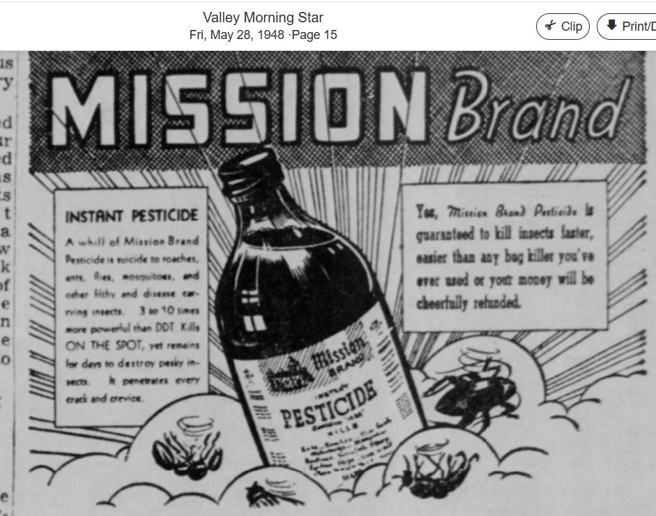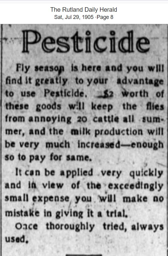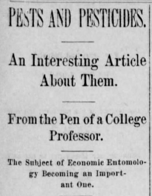 Between 1850-1899, there were 12 total newspaper articles that used the word “pesticide”. An article from 1896 complained that 10% of crops were being lost to pests. It stated, if we could get pests to eat zero percent of the crops, we would make an additional $40 million.