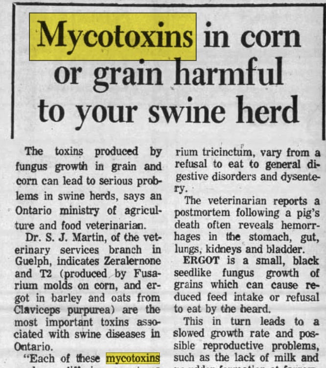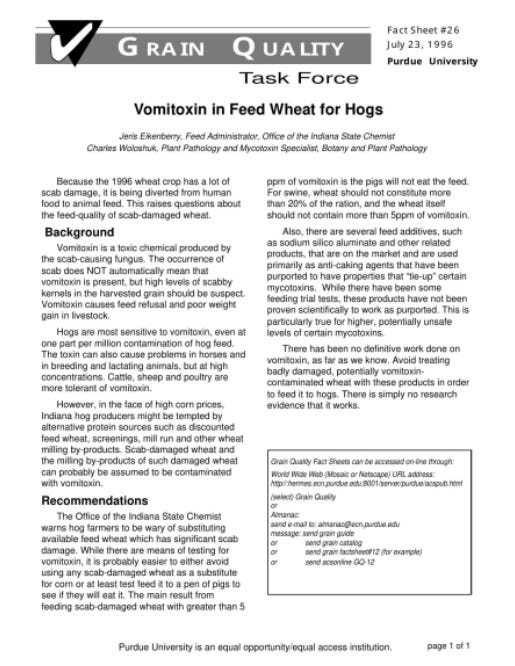 As far as the animals went, “vomitoxin” (a new toxic mold) was said to have been discovered in feed. This newly-found poison was claimed to be what was making pigs vomit, hence its name. Vomitoxin was somehow getting into feed through the wheat, barley, oats, rye, corn, rice, sorghum, and triticale, they said. According to Purdue University, it just so happens that hogs are most sensitive to this toxin, which explains why they had become so terribly ill.