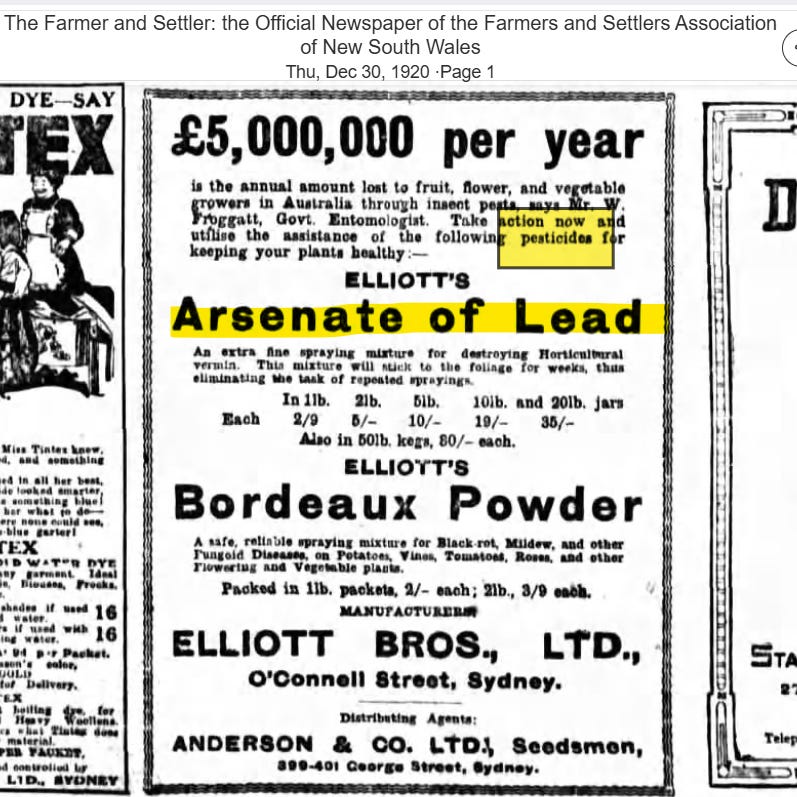 New South Wales, Australia, was peddling an Arsenate of Lead pesticide, which was exactly what it sounds like: arsenic and lead combined (thought to myself: What could possibly go wrong?)