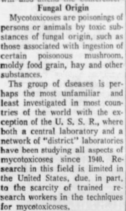 …”Pulmonary mycotoxicosis”, also known as “Silo Unloader's Syndrome” or “Farmer’s Lung”, the medical-science industry said. The culprit? Fungi, mold, and dust containing fungi or mold, they claimed. From Budapest, Hungary, to Scotland to the United States, the men of Science suddenly all began parroting the same; the farmers and their animals are sick because of inhalation or ingestion of large quantities of fungi, mold, or dust containing fungi or mold. The papers mirrored their findings.