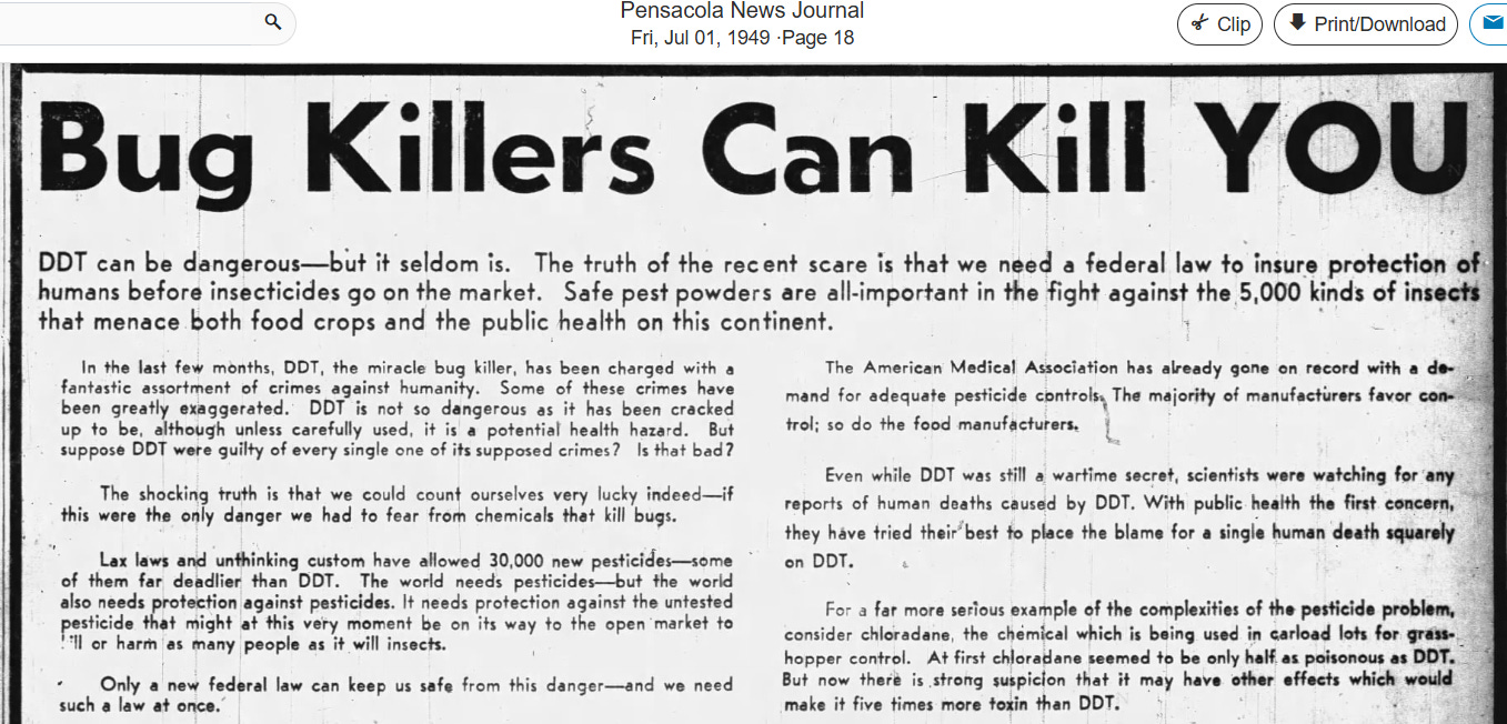 Papers ran psyop articles, like “Bug Killers Can Kill You” which praised DDT as being harmless…