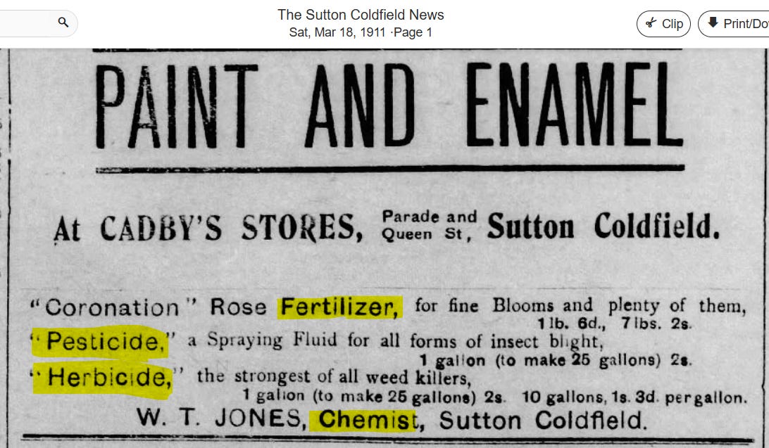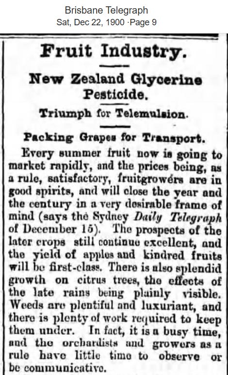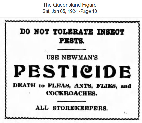 From 1900-1910, the word “pesticide” appeared roughly 40 unique times in the newspaper; the concept of coating food with poison was beginning to expand worldwide. New Zealand was soliciting a glycerine-based pesticide.