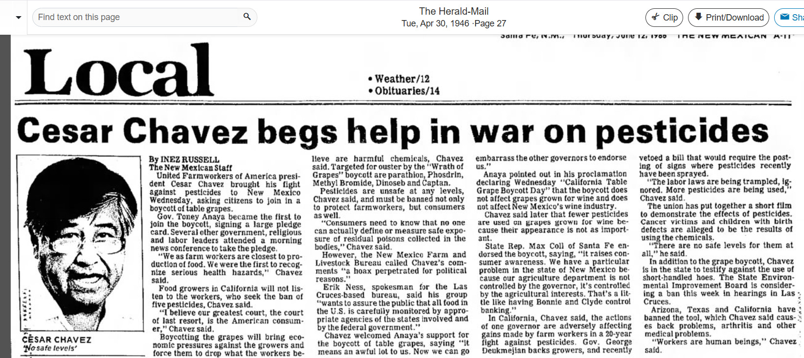 Cesar Chavez, President of United Farm Workers of America, didn’t want pesticides, nor did the people of California. They put together a film showing that pesticide chemicals were responsible for child birth defects, cancer, and a variety of other issues.