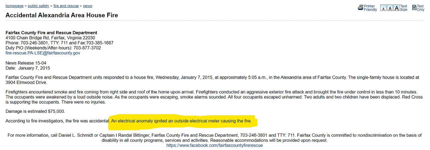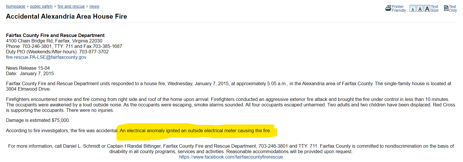 Next we have this link: http://www.fairfaxcounty.gov/fr/news/2015archive/2015_04.htm#, which was captioned, “January 7, 2015: Alexandria, Virginia: Smart meter explodes and causes $75,000 in damage to residence.”, but it now sends you to the Fairfax County Fire and Rescue homepage: