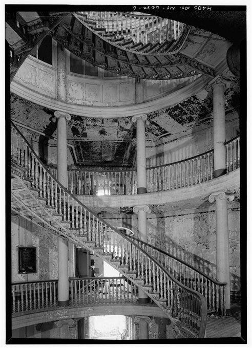 Here’s a staircase in an Insane Asylum, “Welfare Island, Insane Asylum, New York County, NY”. How many insane people were there that would justify this being constructed? And why install this style of staircase in a place where nurses and doctors needed to quickly reach patients?