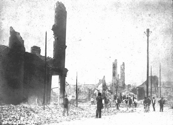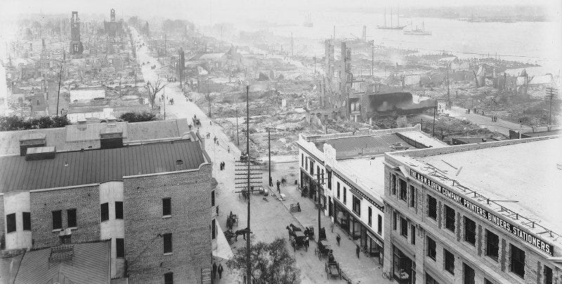 Here’s a list of nearly back-to-back fires, all called Great Fires (words have meanings. Yes, great does mean large but it also means excellent). These massive blazes began in the 1800s, but were frequent specifically between 1901-1918; a 17-year window. There were indeed other fires, but the “Great Fires” were the ones that leveled entire cities, and those that occurred during that small timeframe are what we are going to look at, in chronological order. Oh, and I should probably mention, many of these fires are “cause unknown”. And I should also tell you…