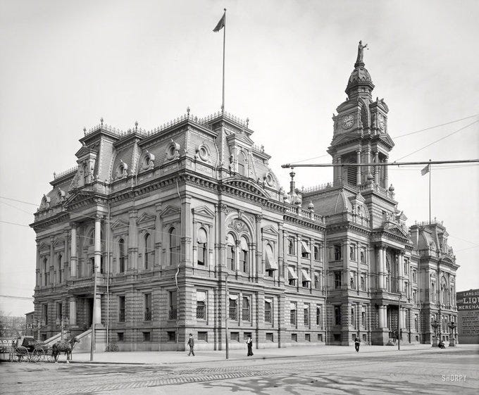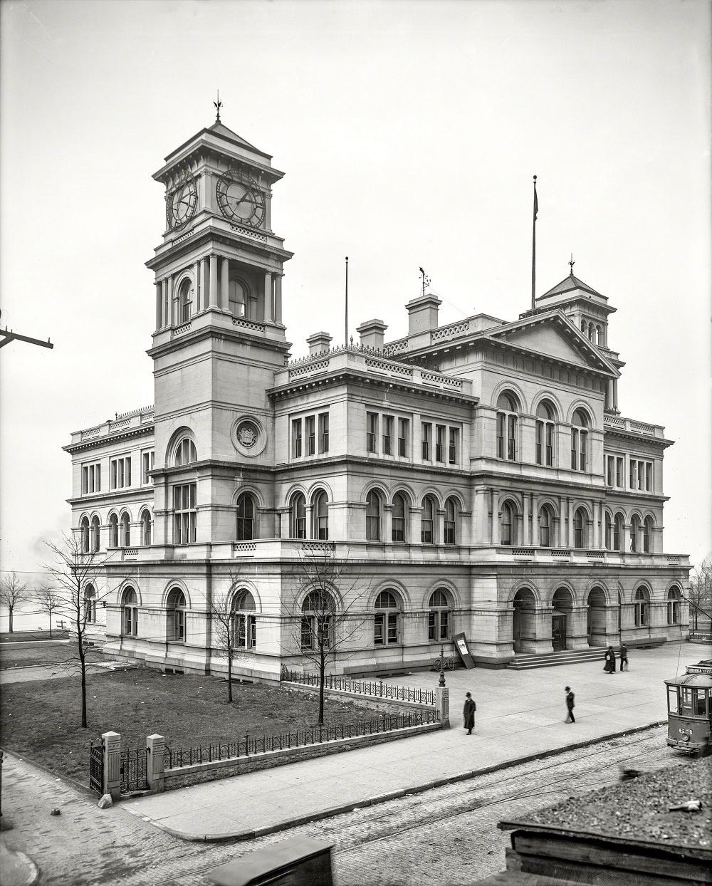 Being that I am a researcher, I wanted to get to the bottom of this to figure out where truth lays lies (where truth lies? Maybe that should be the title of this article?). I assumed, being that these building are absolutely marvelous and surely cost a fortune to build, there must be rich history of them. I assumed, if I dug deep enough, I would be able to find land contracts, contracts with builders and corresponding articles in the newspapers about the construction of the marvelous courthouses, hospitals and schools. I assumed I would easily locate drawings and photographs of the construction of these places and I thought, if I looked hard enough, I could even locate who financed the building process, how the materials were brought in (pre-dating railroads, planes and electricity) and even discover who manufactured the materials because, clearly, it would have taken immense manpower and materials to create this library and this post office in Memphis, Tennessee (pre-1906):