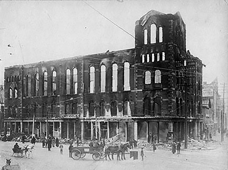 The first Great Fire during the 17-year timeframe was the Great Fire of 1901 which occurred in Jacksonville, Florida, on May 3rd. It was one of the worst disasters in Florida history and the third largest in US history. It left the city in ruins: