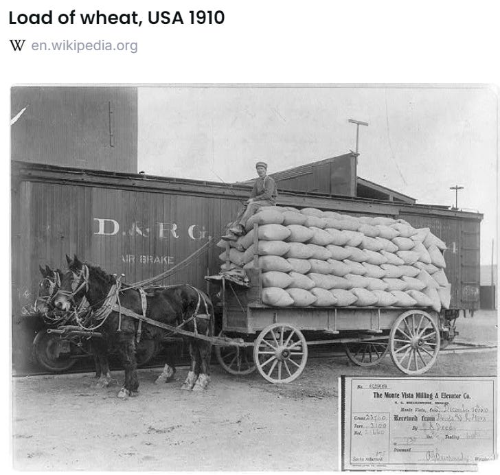How much weight can wagon wheels support? I once drove my truck to go pick up large rocks for my pond and just a few of them added immense weight to my vehicle, pushing the rubber tires down hard - so much so that, although I had space in the truck bed, I had to make two trips due to weight. Now imagine that weight in a wagon with skinny tires… ? Here’s a load of wheat on a wagon: