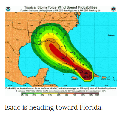 Here is the NOAA.gov graphic the GOP showed to justify the last-minute cancelation. I like the huge text that says “Isaac is heading toward Florida”, just to clarify that, although the map shows Isaac on Florida, this isn’t actually true: