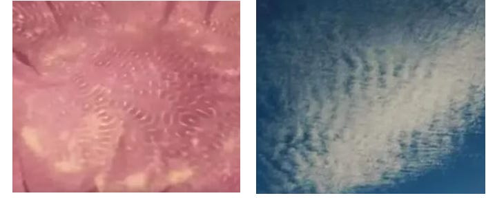 Throughout the video we see the water forming the identical shapes as the clouds: