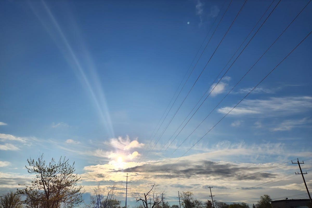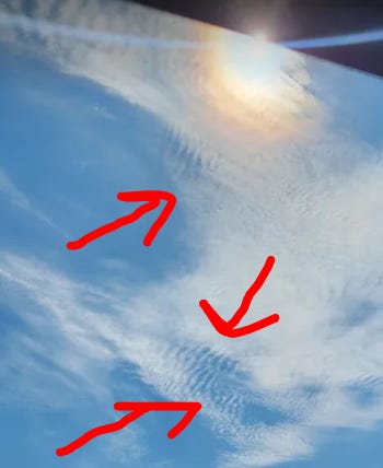 If you look at the image below, you can see the frequency lines (they often look like fish bones), pushing the clouds downward, over the sun: