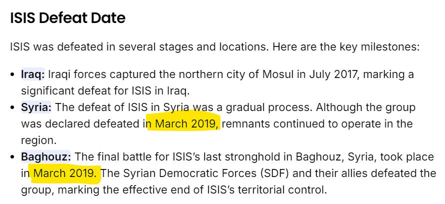 Let’s look up when bad Isis was defeated…