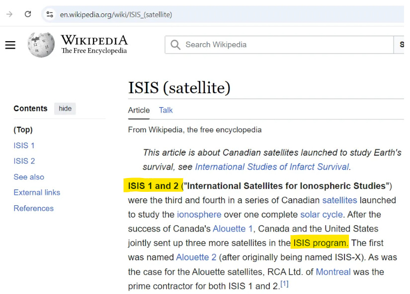 Did I mention there is also a satellite in outer space named Isis? And guess what? It is part of the Isis program (because you only believe satellites exist because you have been programmed to believe something which the only evidence of its existence is CGI and words (WORDS = SPELLing!)):