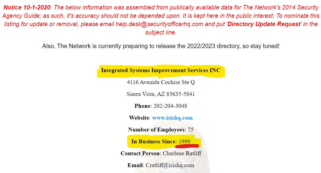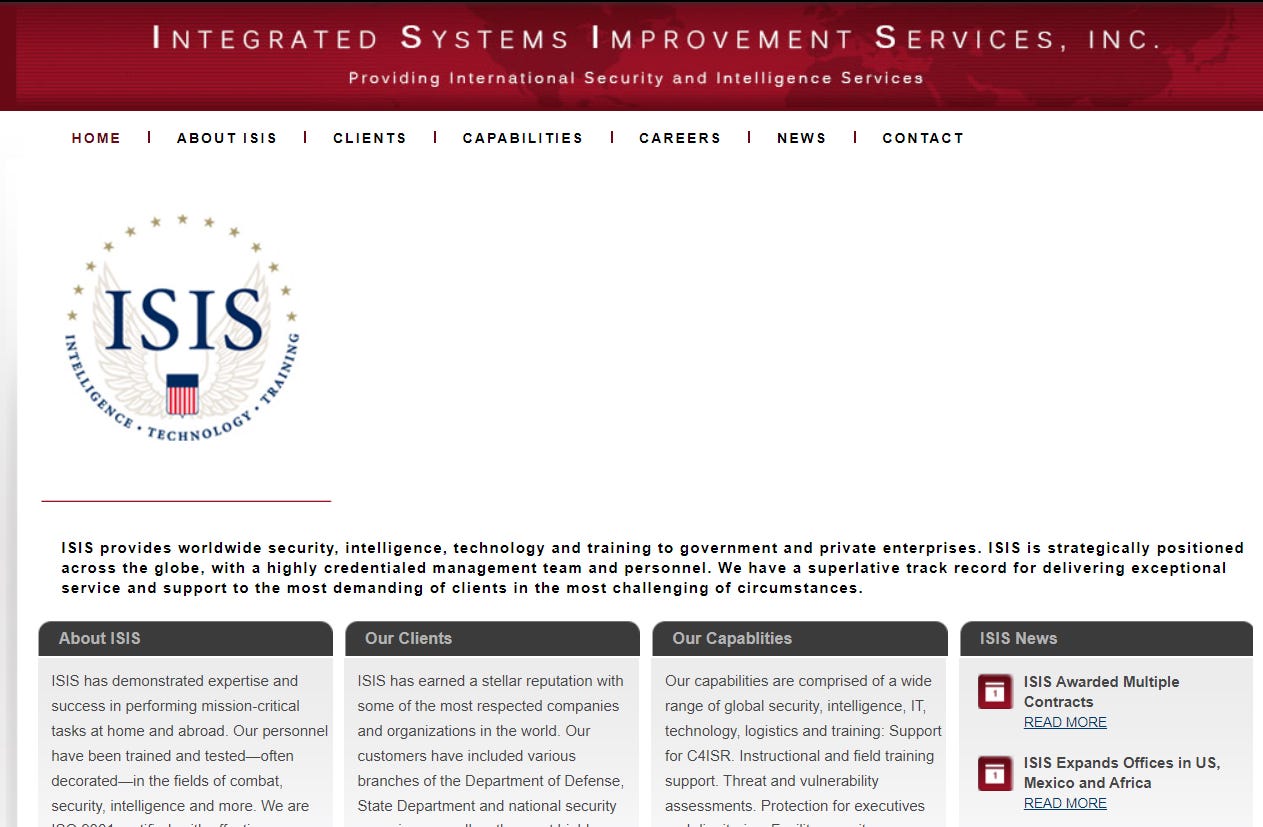 Yeah, Isis was a government contractor whose “personnel have been trained and tested - often decorated - in the fields of combat, security, intelligence and more”. Isis customers included “various branches of the Department of Defense and national security…”. I should mention that this information, including the Isis website, has been scrubbed harder than a VAERs report: