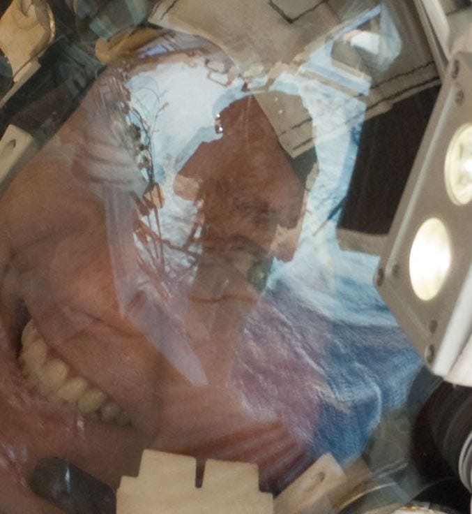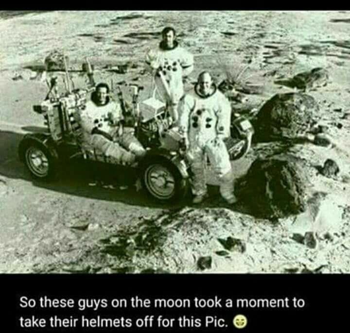 … then this image also surfaced, which demonstrates that you don’t need oxygen on the moon, which explains why the men in the helmet-reflections are helmetless: