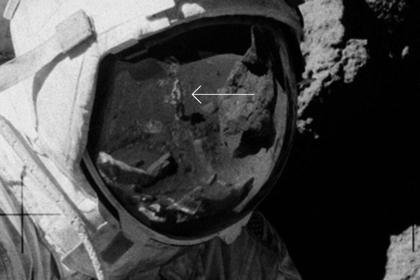 The reflection in his helmet clearly shows the movie set moon: